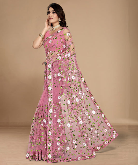 Pink Soft Net Saree with Delicate Floral Embroidery