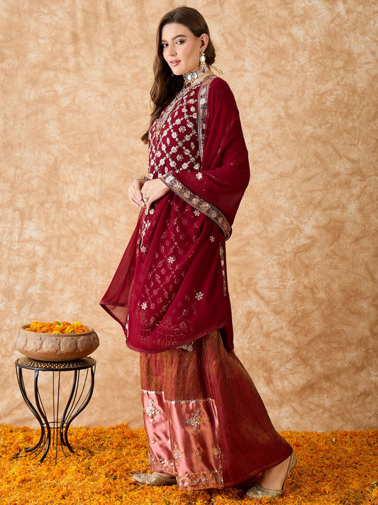 Semi Stitched Pakistani Suit in Maroon Faux Georgette