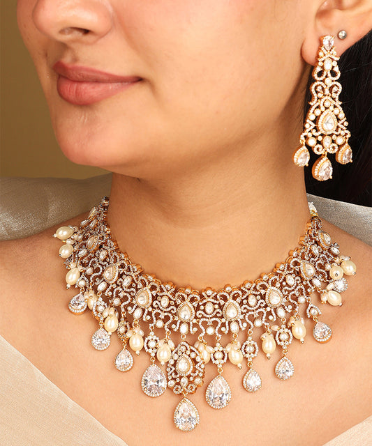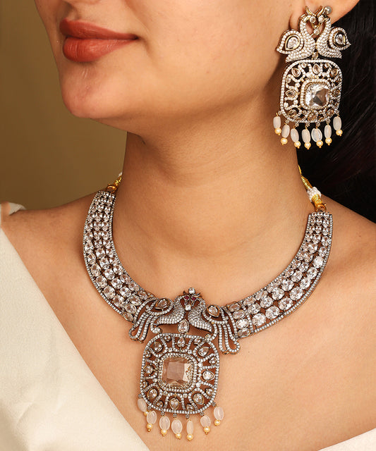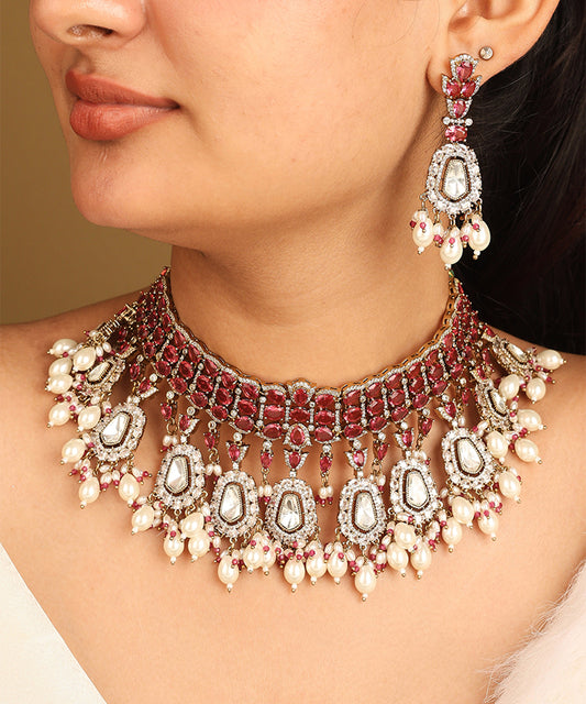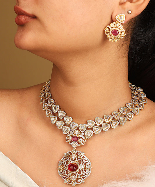 American Diamond Necklace Set with Ruby Pendant and Earrings