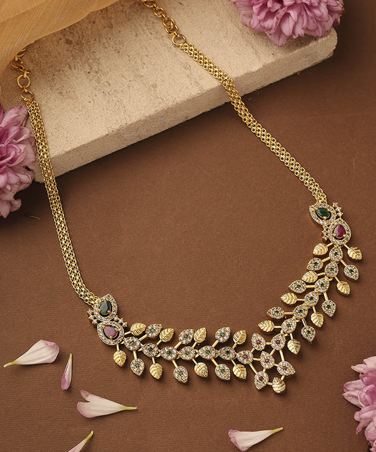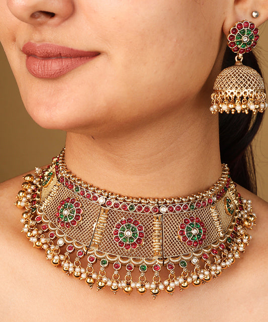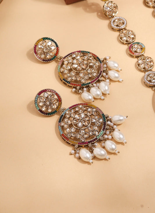 Antique Gold Necklace with Multicolour Stones and Matching Earrings