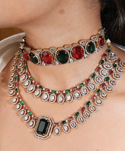 American Stone Choker and Two Layer Necklace Set in Red and Green