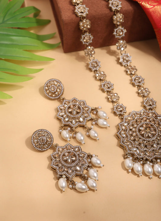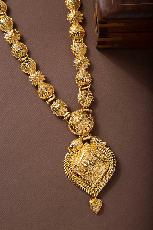 Ancient Style Curved Gold Plated Necklace with Intricate Carvings and Beaded Earrings