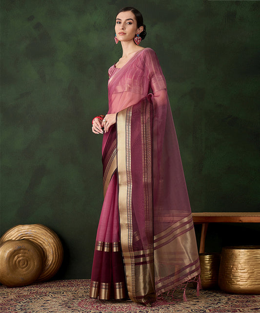 Wine Cotton Silk Saree with Ornate Gold Zari Border