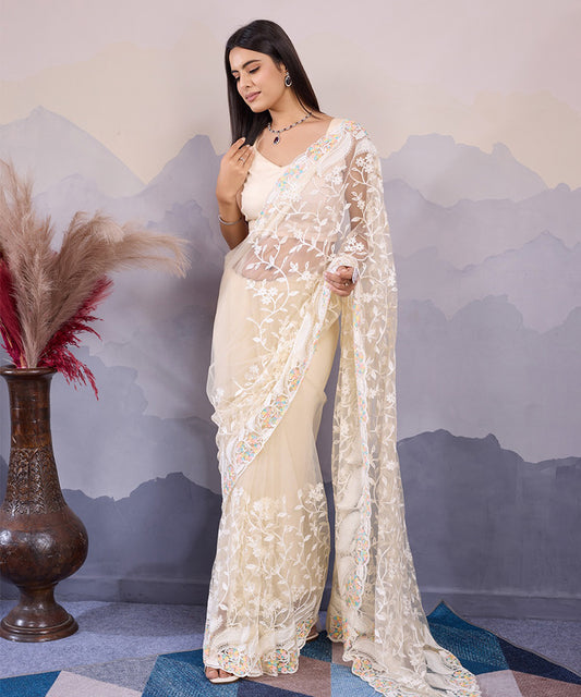 White Net Floral Printed Saree with a Breezy Lightweight Blouse