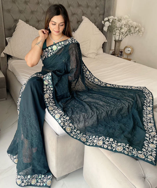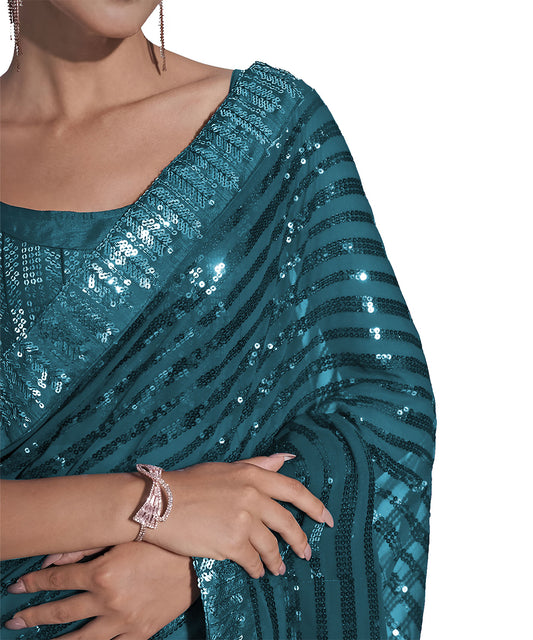 Women's Sequence Work Georgette Teal Saree with Unstitched Blouse