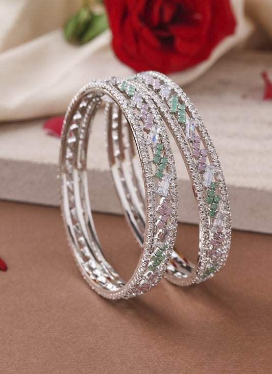 Silver-Plated Bangles with Pink and Mint Green American Diamonds
