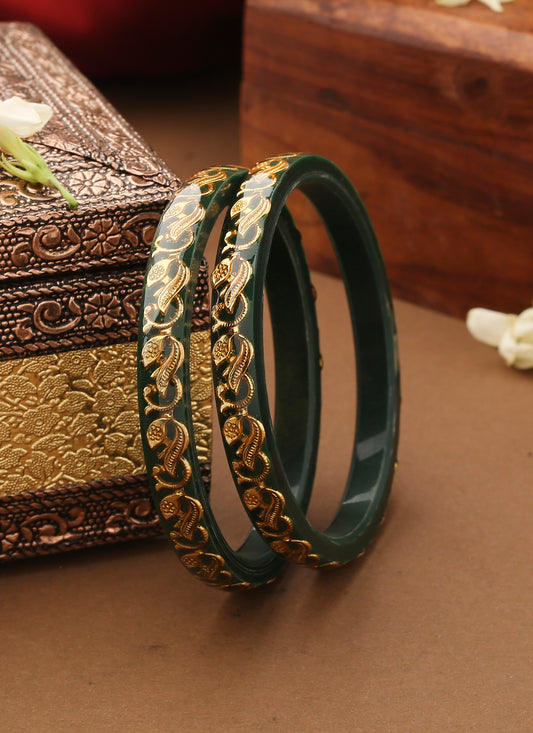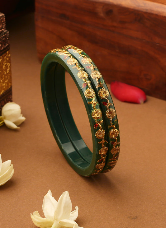 Set of 2 Traditional Kundan Green Bangles With Gold Design