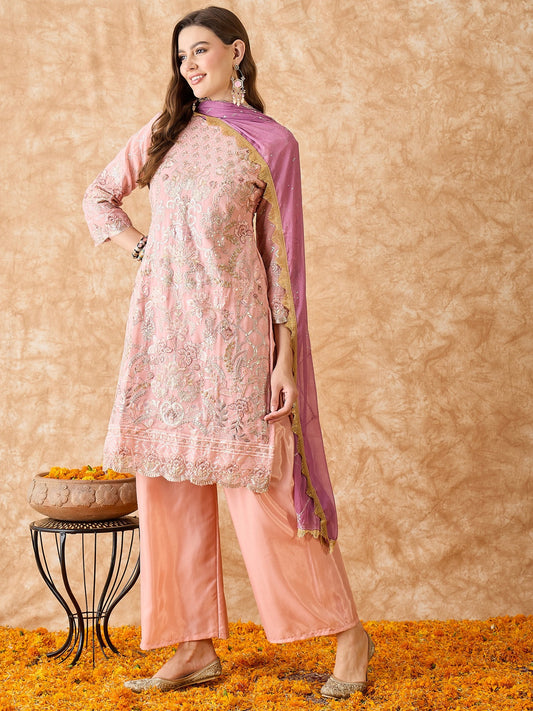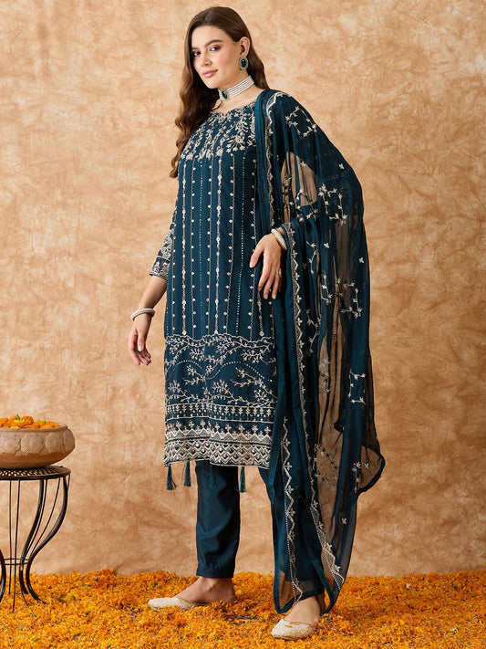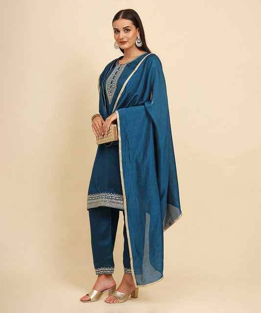 Kurta Set Teal Blue Silk Blend Embroidered with Pant and Dupatta