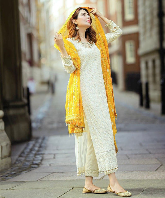 White Cotton Embroidered Kurta with Pant and Dupatta