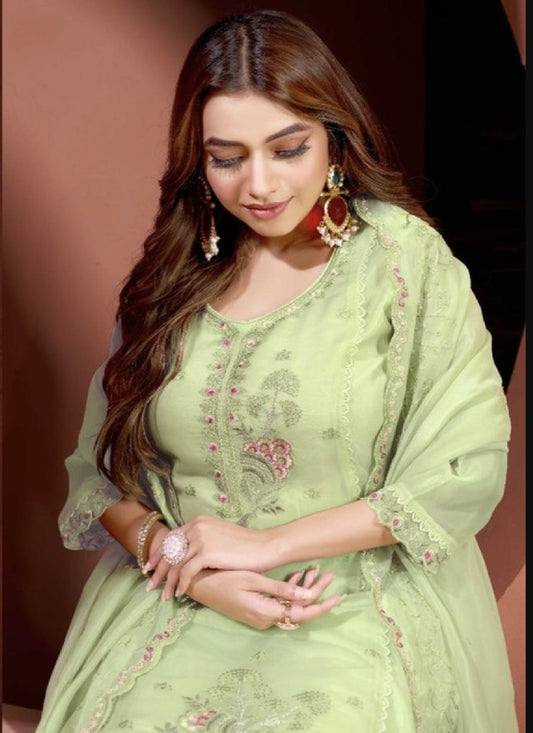 Green Viscose Embroidered Kurta with Pant and Dupatta