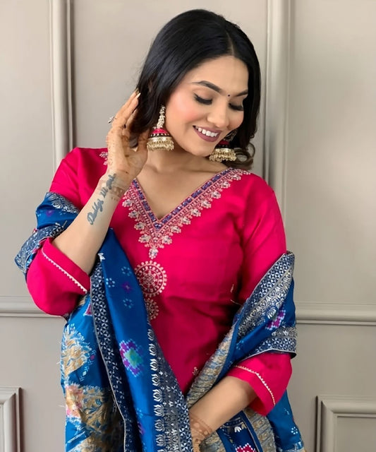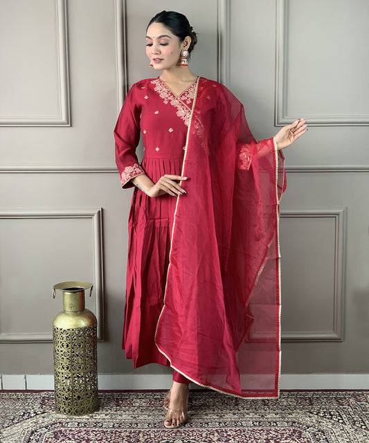 Kurta Set Red Silk Blend Embroidered with Pant and Dupatta