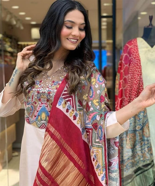 Kurta Set Off White Silk Blend Embroidered with Pant and Dupatta