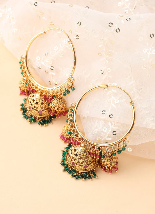 Gold Hoops with Jhumka Detailing and Green Bead Accents