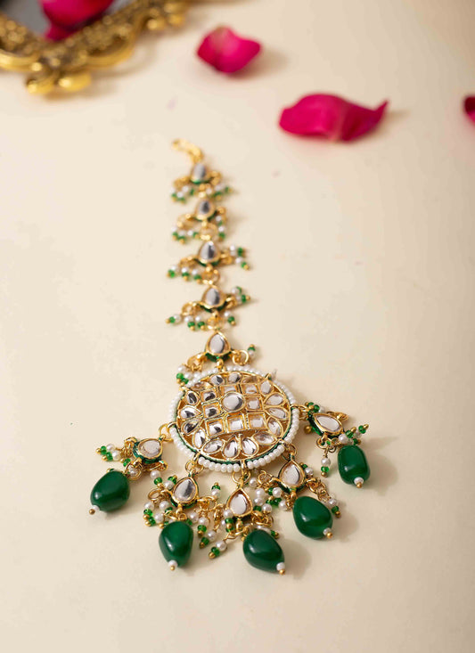 Kundan Pearl and Emerald Maang Tikka Earrings Set