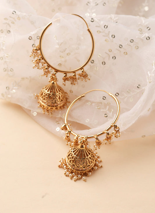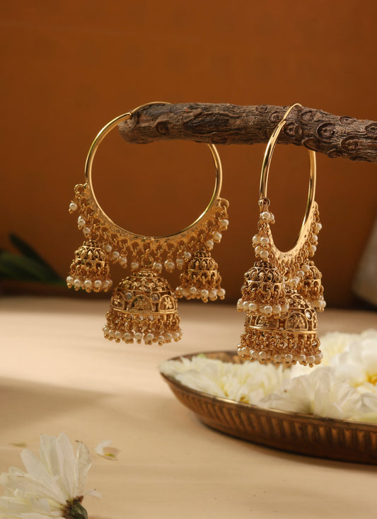Gold Hoops with Jhumkas and Pink Bead Accents
