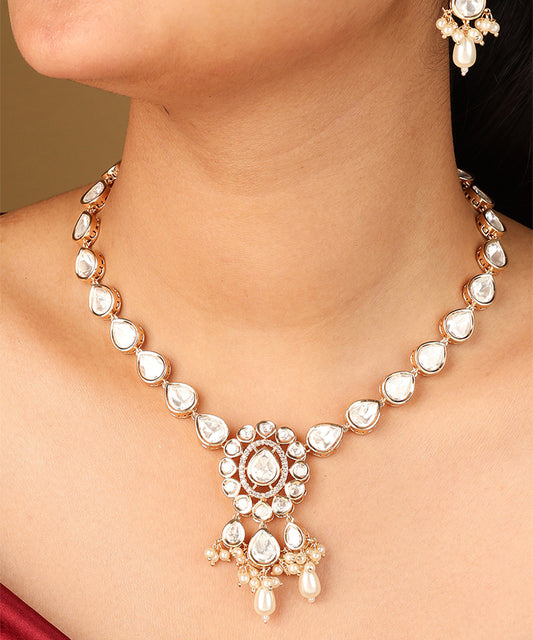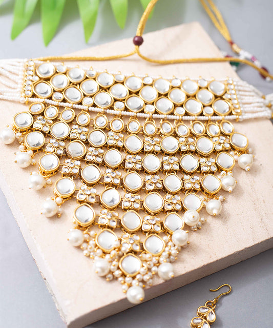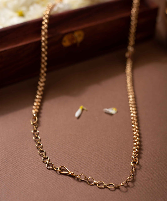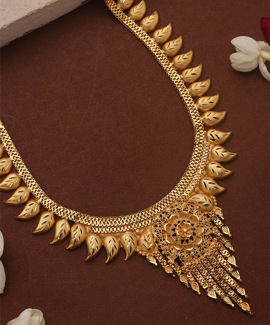 Ancient Style Curved Gold Plated Necklace with Intricate Carvings and Beaded Earrings