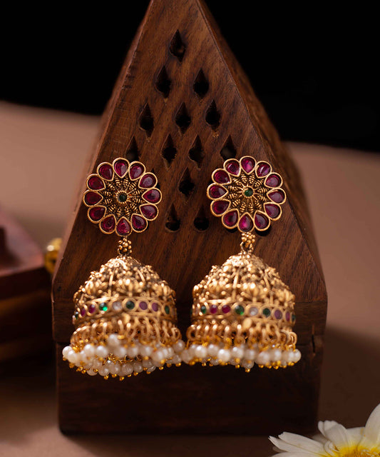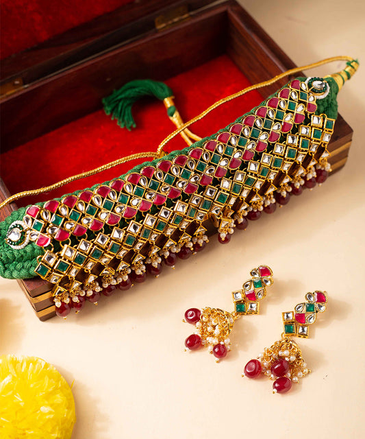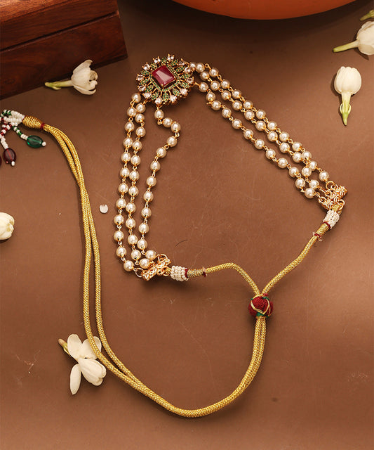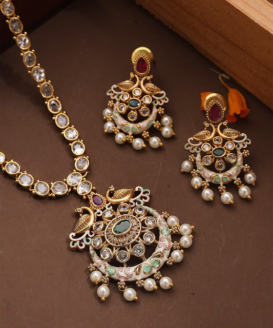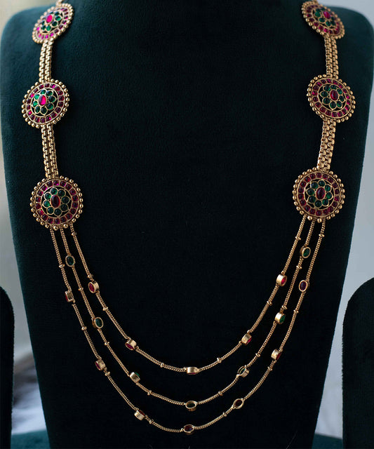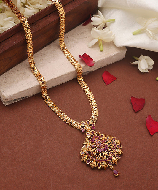 Gold Plated Long Necklace Set with Ruby Stone Studded Pendant