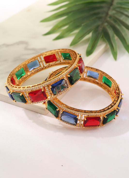 Set of two Gold Bangles with Green, Red and Blue Rubies