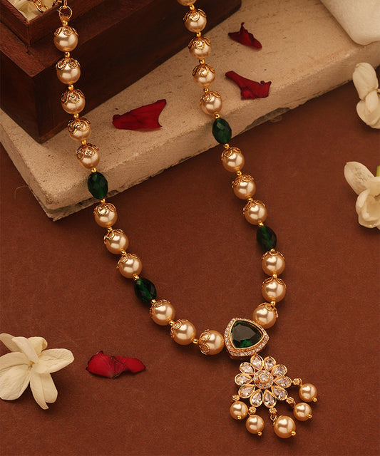 Pearl Necklace with American Diamonds and Green Stone Accents