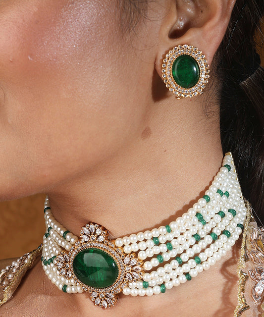 Pearl Choker with Emerald Stone Pendant