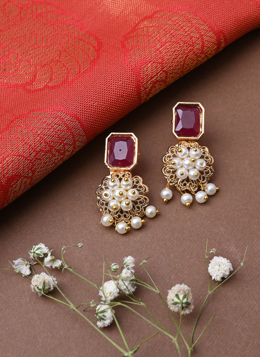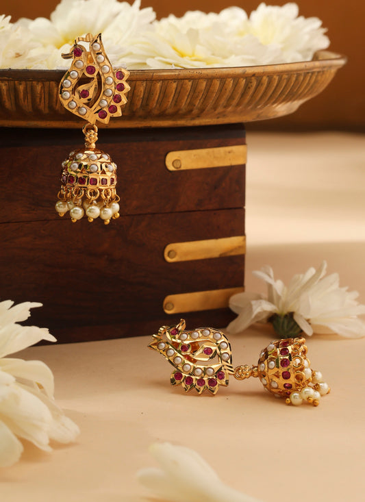 Gold Plated Necklace with Pearl Jhumkis and Stone Studded Earrings Set