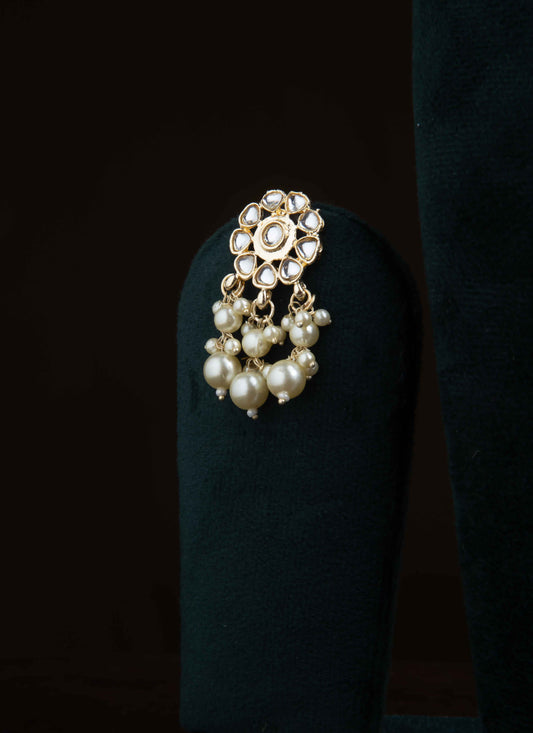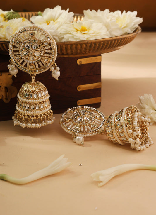 Kundan Jhumkas with White Beads and Gold Detailing