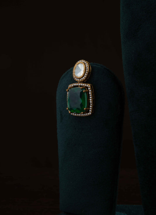 Gold Plated Necklace with Transparent Stones and Green Pendant Square Green Stone Earrings