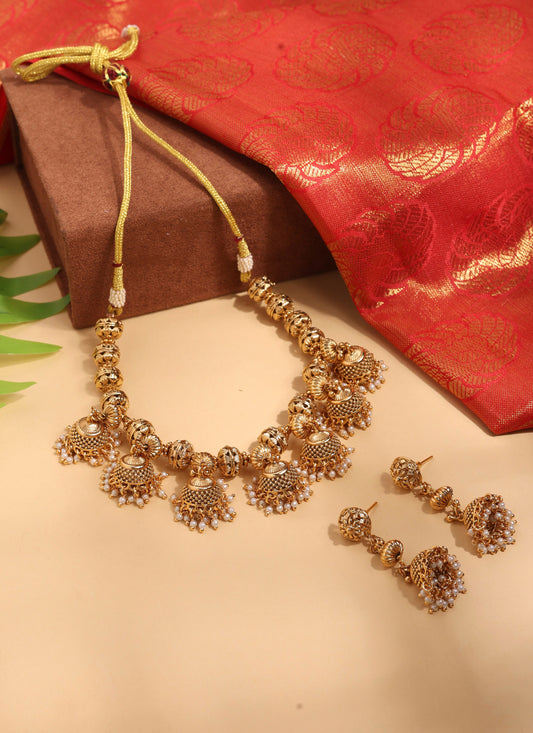 High Gold Necklace Set with Jhumka Style Details and Matching Earrings