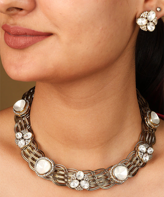 Indo Western Floral Gold Hasli Necklace with Matching Earrings