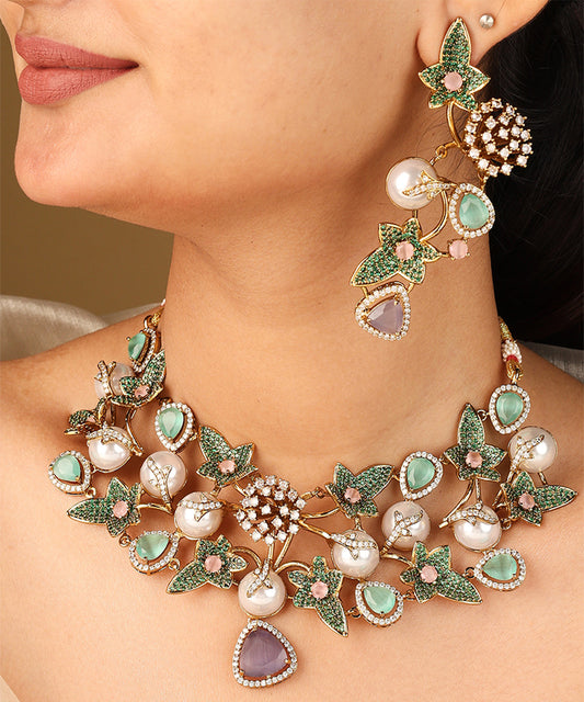 Statement Necklace with Green Stones and American Diamonds