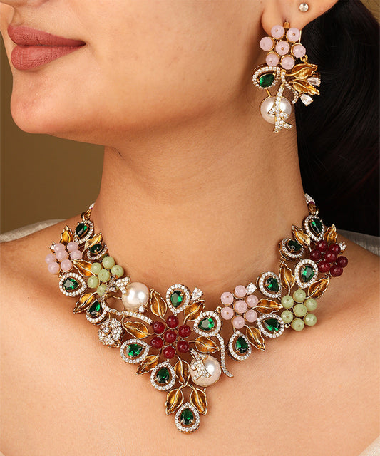 Floral Inspired Statement Necklace with Green and Pink Stones and Matching Earrings