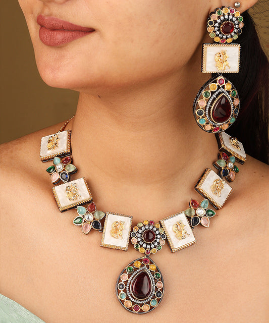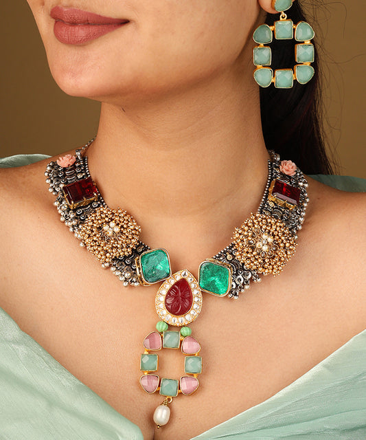 Multicolour Monalisa Stone Necklace Set with Jadau Work