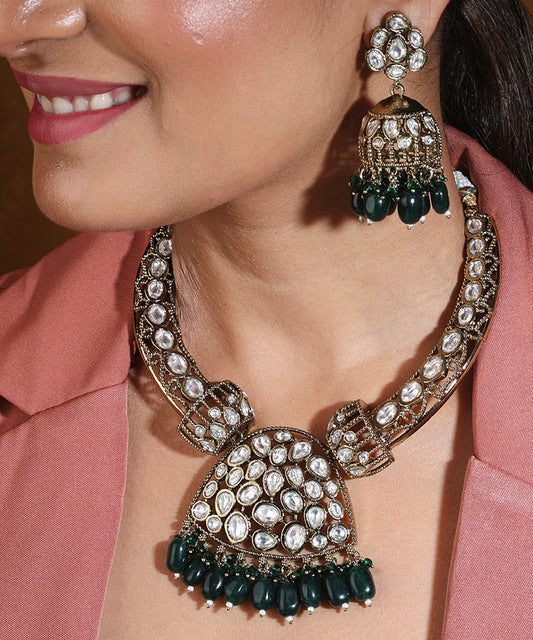 American diamond Kundan necklace set with green bead accents