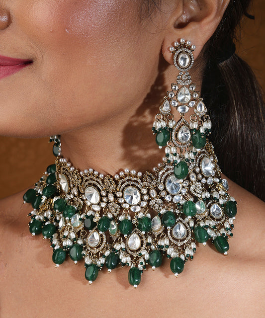 Bridal Choker Necklace with Kundan Stones and Green Drops