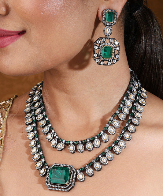 Two Layer Necklace with Green Emerald Stone and Square Pendant