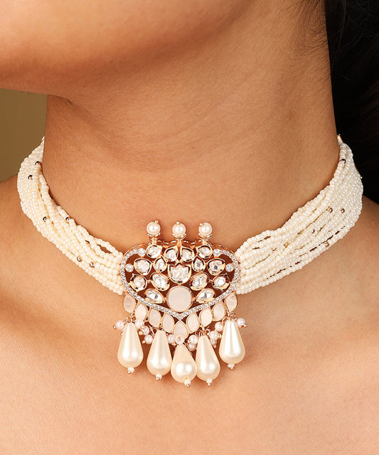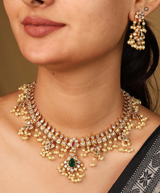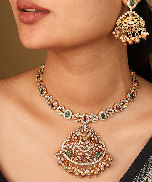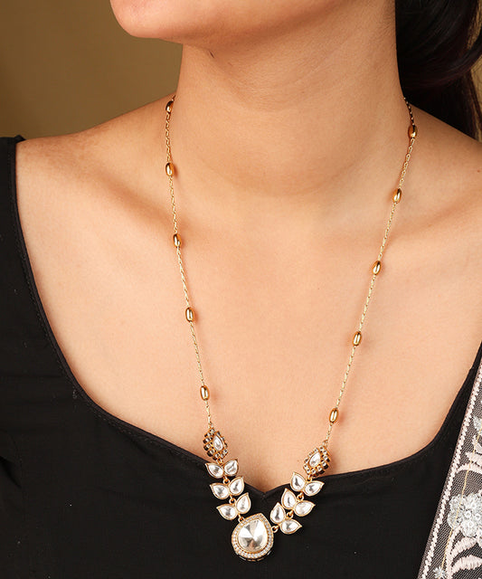 Gold Plated Necklace with Transparent Kundan Stones and Raindrop Pendant Set
