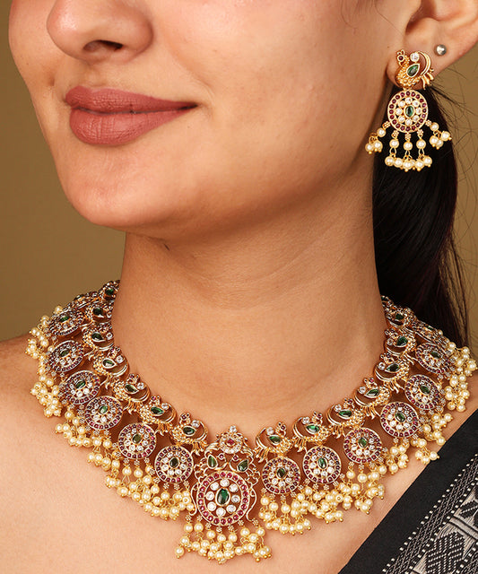 Gold Plated Guttapusalu Necklace with Red Stone Accents Jhumkis and Pearl Pendant
