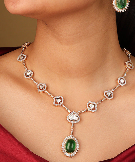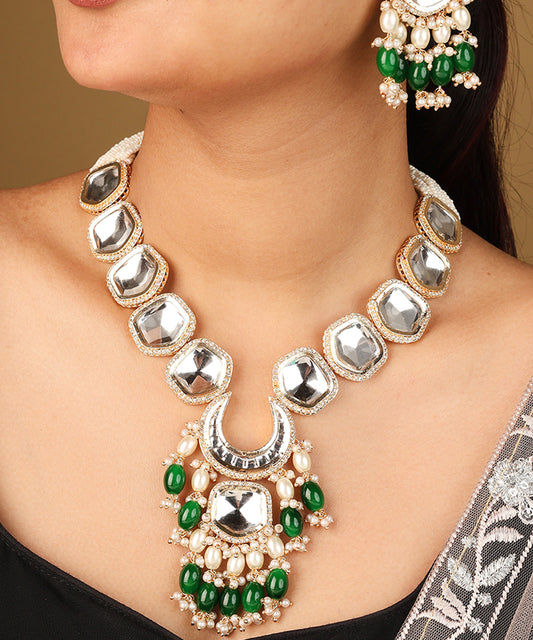 Necklace with Shapeless Transparent Kundan Stones and Dark Green Jhumkis