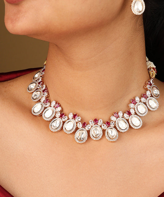 Stunning Raindrop Pendant Necklace with Red and Transparent Stones and Pearl Jhumkis