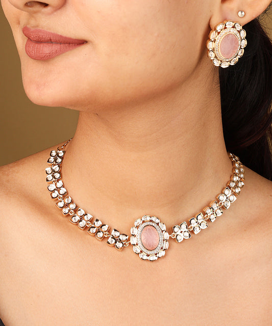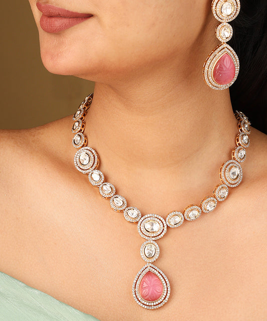 Gold Plated Necklace with Circle Transparent Stones and Pink Pendant Set
