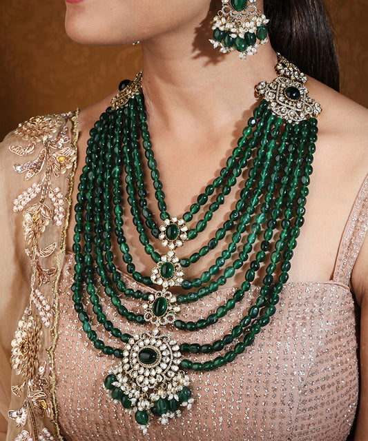 Layered Maharani Haar Necklace with Green Beads and Kundan Stone Pendant