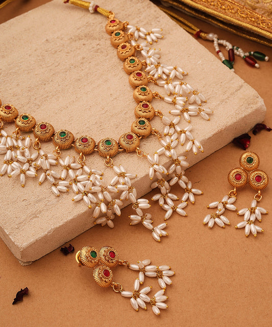 Gold Cup Necklace with Red Stones and White Oval Jhumkis