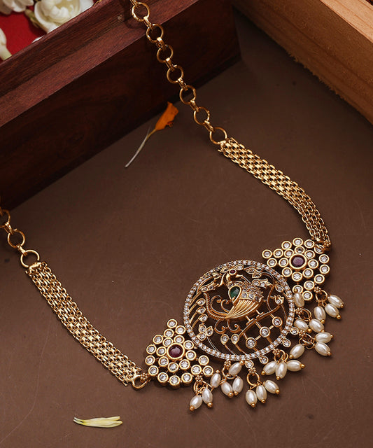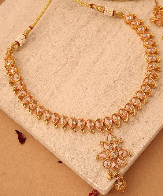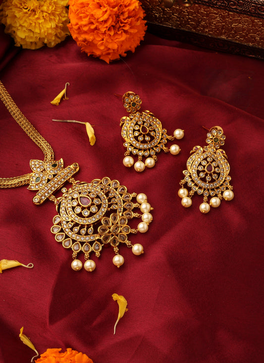 Gold Plated American Stone Studded Necklace Set in South Indian Style