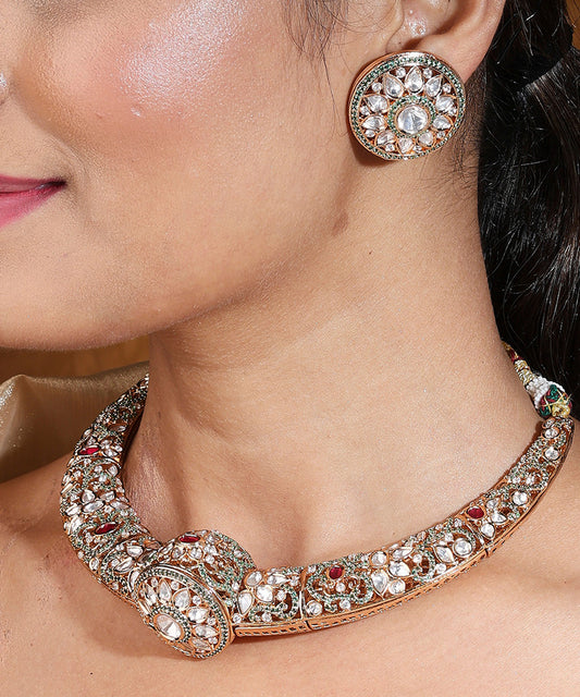 Statement Hasli Necklace with Red and Green American Diamond Stones and Stud Earrings