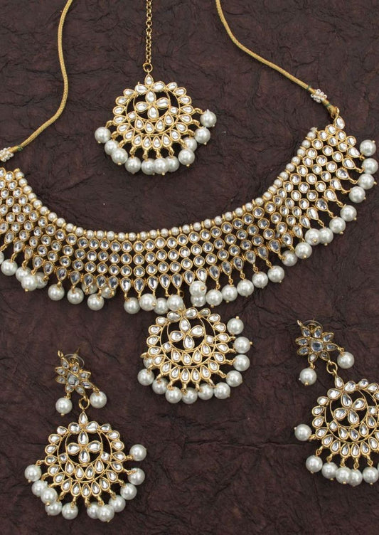 White Gold Choker Set With Earrings And Maang Tikka