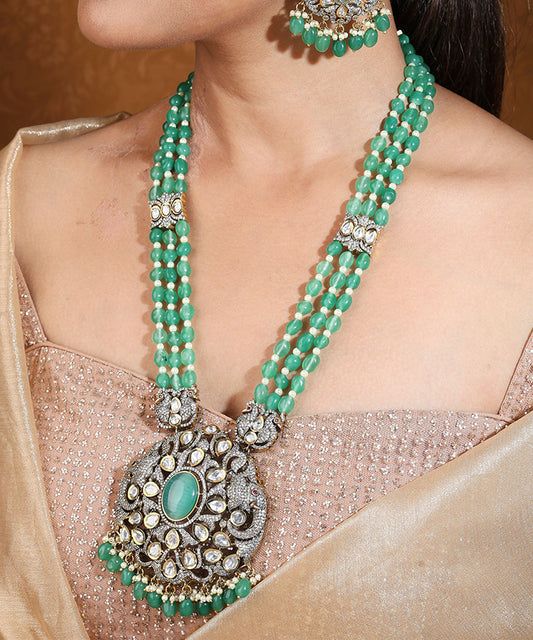 Mint Green Bead Necklace with American Stone Studded Elephant Motif Pendant
