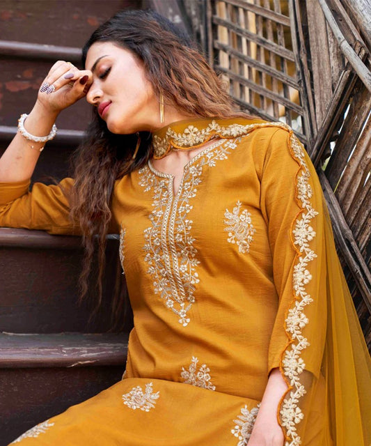 Mustard Silk Blend Embroidered Kurta Pant with Dupatta