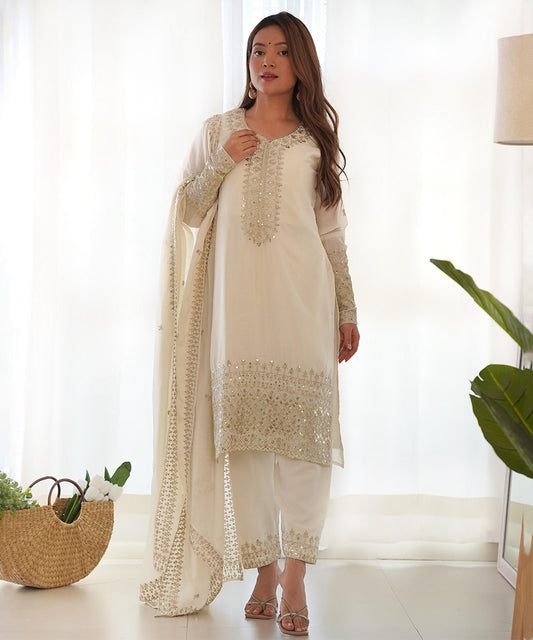 White Chanderi Silk Heavy Embroidered Kurta Pant with Dupatta