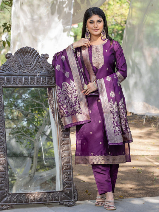 Purple silk blend jacquard kurta pant with dupatta