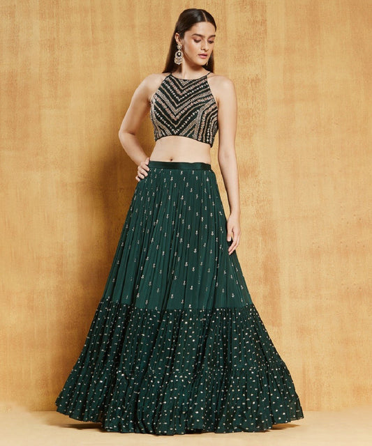 Green Zari Sequin Embroidered Georgette Wedding Lehenga Unstitched